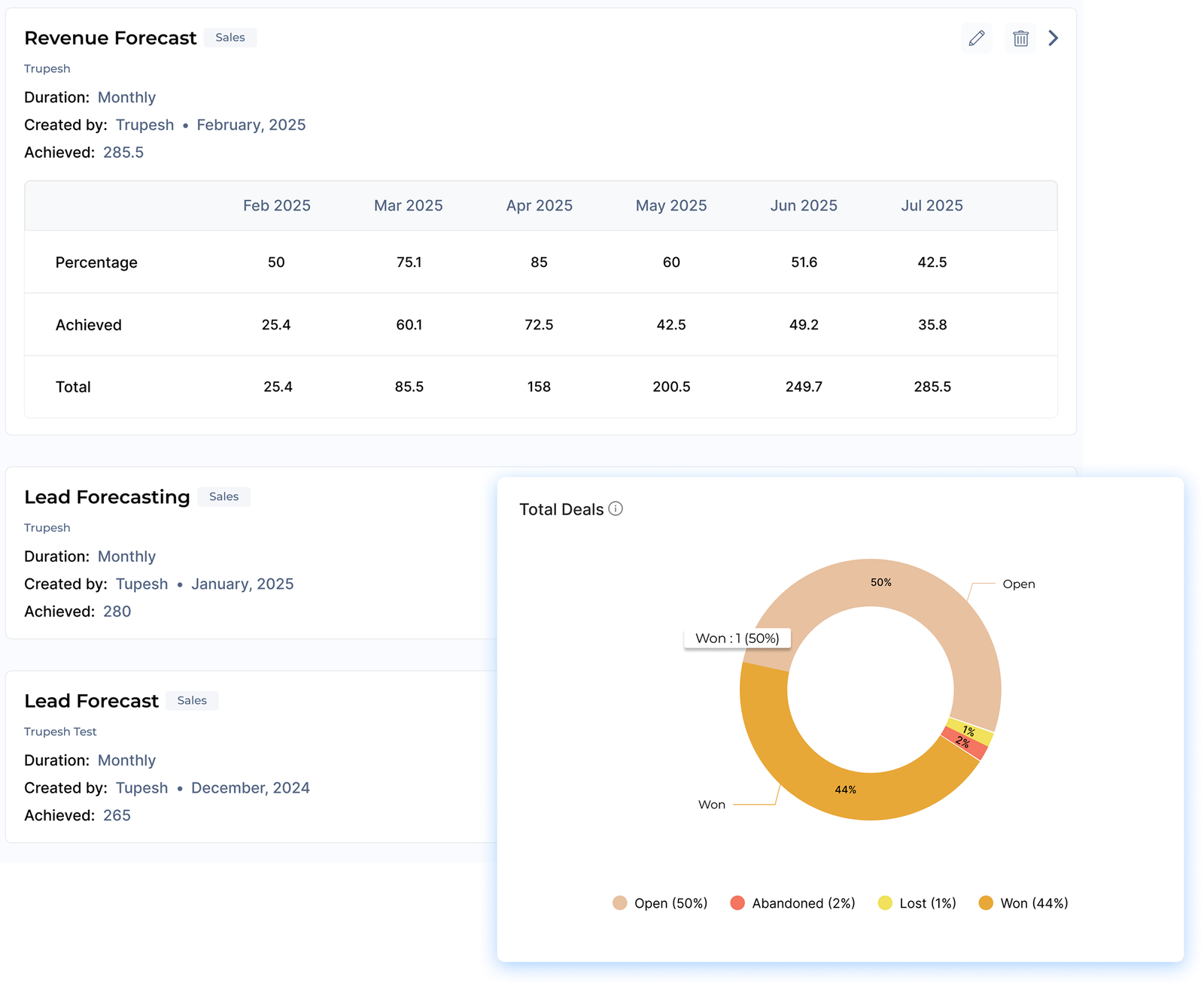 The feature uses historical data, current pipeline information and external factors to predict future sales performance. Teams are enabled to model different outcomes based on various assumptions. An accurate sales forecasting process is crucial for resource allocation, budgeting and setting realistic sales targets.